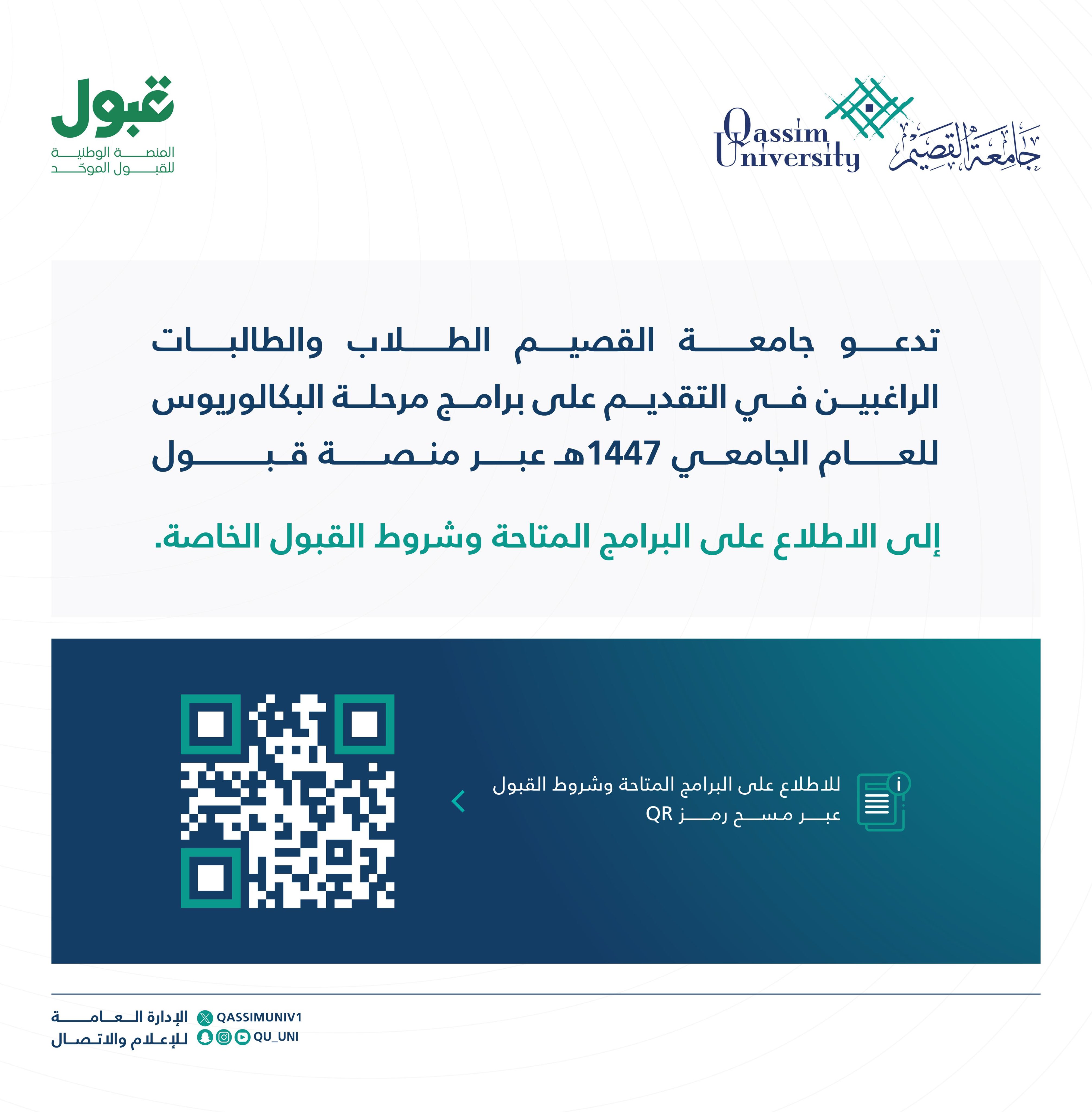 جامعة القصيم تدعو الطلاب والطالبات الراغبين في الالتحاق ببرامج مرحلة البكالوريوس للعام الجامعي 1447هـ، إلى التقديم عبر منصة “قبول” الوطنية،